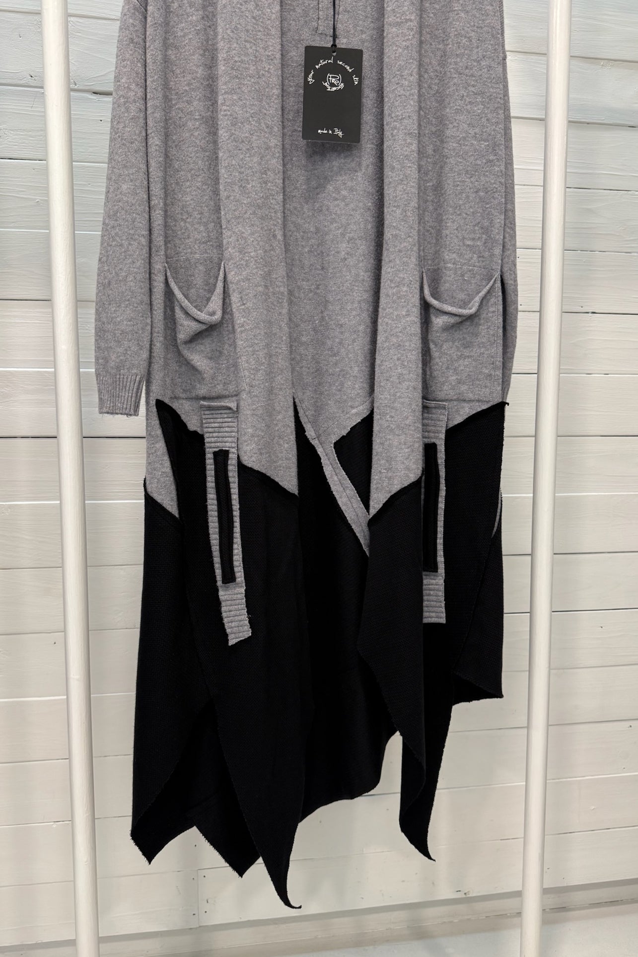 Cardigan lungo senza bottoni con applicazioni. 2 tasche frontali.